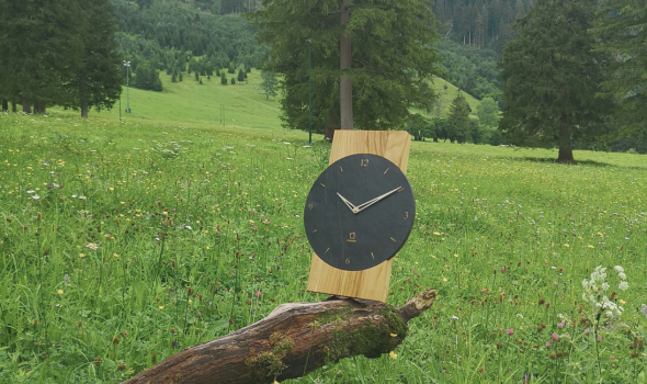 Natuhr Schiefer Wanduhr Steinbuche Buche geölt schwarzer Stein goldene Zeiger